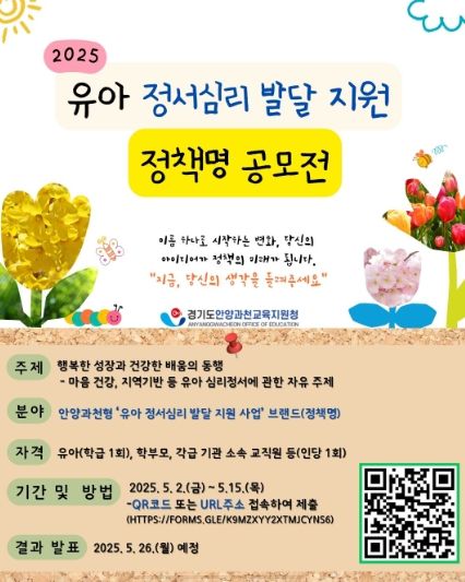 (아름다운교육신문) 안양과천교육지원청은 오는 5월 15일부터 ‘유아 정서심리 발달 지원 사업 정책명 공모전’을 개최한다고 2일 밝혔다.