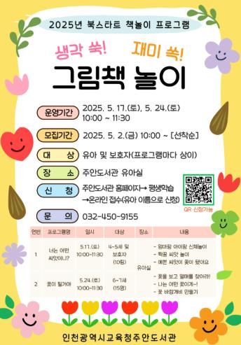 4~7세 유아와 보호자를 위한 ‘생각 쑥! 재미 쏙! 그림책 놀이’는 5월 17일, 24일 주안도서관에서 진행되며, 5월 2일 10시부터 도서관 누리집에서 신청할 수 있다.