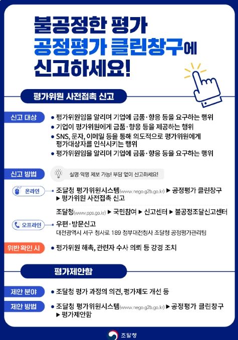 (아름다운교육신문) 조달청은 1일부터 조달평가 과정의 불공정 행위 근절을 위해 평가위원 사전접촉 신고센터의 익명 제보를 허용하고, 평가와 관련한 자유로운 의견 제출 기능을 추가한 ‘공정평가 클린창구’를 개설해 운영한다.