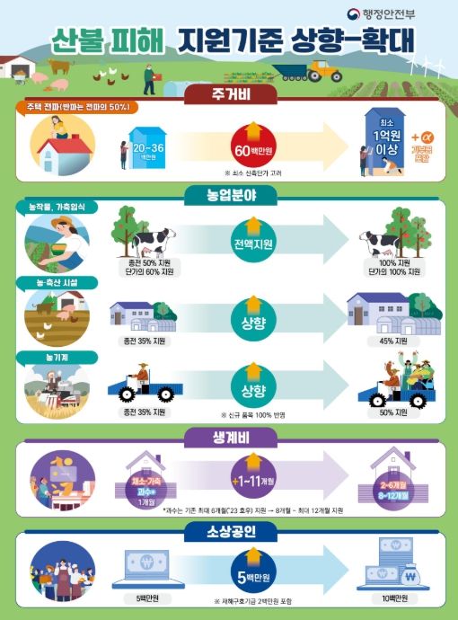 고기동 중앙재난안전대책본부장은 “이번 산불 피해 지원기준 상향‧확대 방안은 피해 심각성과 현장의 다양한 현실적 여건을 종합 고려해 마련했다”라며, “정부와 자치단체는 피해 주민께서 일상으로 빠르게 복귀할 수 있도록 최선을 다해 지원하겠다”라고 밝혔다.