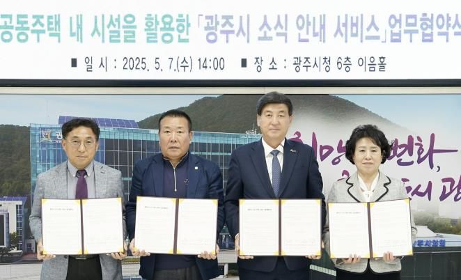 이번 협약은 ▲광주시 아파트입주자대표회의 연합회 ▲광주시 공동주택발전협의회 ▲태전 아파트연합회와 함께 진행됐으며 공동주택 내 엘리베이터TV, 게시판 등 주민들이 일상적으로 접하는 공간을 활용해 시의 주요 시정 소식과 생활 정보를 신속하고 효과적으로 전달하기 위해 마련됐다.