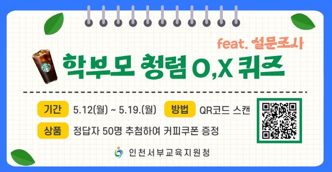 (아름다운교육신문) 인천서부교육지원청은 5월 12일부터 19일까지 관내 학부모를 대상으로 청렴 인식 제고 및 부패 실태 파악을 위한 '청렴 퀴즈 및 설문조사'를 진행한다.