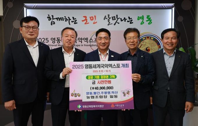 (아름다운교육신문) 충북 영동군 영동·황간·추풍령·학산농협 조합장들은 지난 12일 ‘2025 영동세계국악엑스포’의 입장권 구매에 사용될 성금 4,000만원을 영동군에 공동 기탁했다.