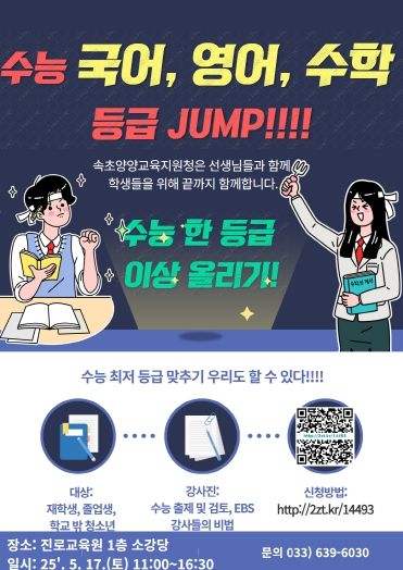 (아름다운교육신문) 속초양양교육지원청은 5월 17일 11시 진로교육원에서 관내 수험생들의 학습 전략 확보 및 수능 학습 능력 강화를 위해 ‘2025학년도 수능 국·영·수 한 등급 올리기 프로젝트’를 운영한다.