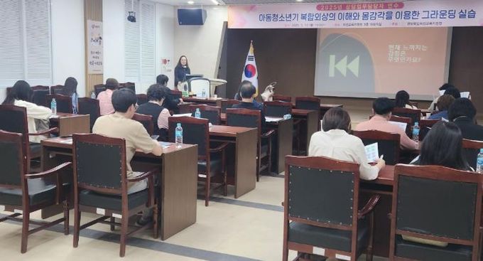 이번 연수는 의성 지역 산불 재난으로 인한 심리적 외상 및 아동청소년기 환경에서의 복합 외상에 대한 이해와 몸 감각을 이용한 그라운딩 실습을 통해 감정을 안전하게 느낄 수 있는 경험을 제공하고 심리 안정화 기법을 익히는 것을 목적으로 ‘품은심리교육센터 이승민 강사’의 강의로 진행됐다.