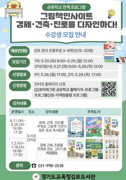 (아름다운교육신문) 경기도교육청김포도서관은 공유학교 프로그램의 일환으로 ‘그림책 인사이트: 경제·건축·진로를 디자인하다!’를 6월 11일부터 매주 수요일, 총 6주간 운영한다.