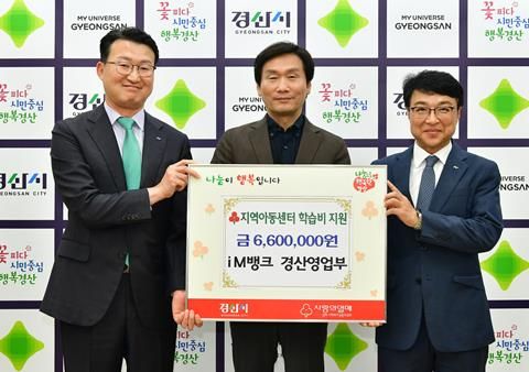 (아름다운교육신문) iM뱅크 경산영업부는 14일 경산시청을 방문하여 관내 지역아동센터 이용 아동들의 학습비 지원을 위해 성금 660만원을 기탁했다.
