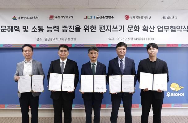 울산교육청은 이번 사업을 더욱 내실 있게 운영하고자 14일 부산지방우정청, JCN울산중앙방송, 우체국물류사업단, 사단법인 온기와‘편지쓰기 문화 확산을 위한 업무협약’을 체결했다.