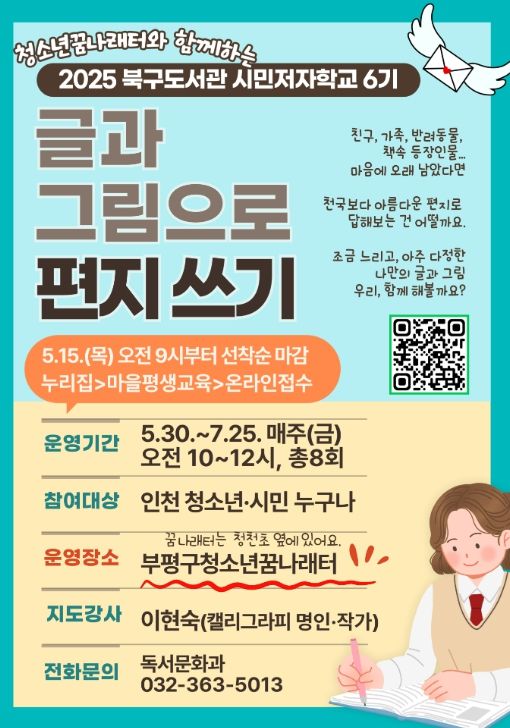 (아름다운교육신문) 인천광역시교육청북구도서관은 시민의 ‘읽걷쓰’ 역량 강화와 지역 독서 문화 확산을 위해 2025년 시민저자학교 6기 프로그램 ‘글과 그림으로 편지 쓰기’를 오는 5월 30일부터 7월 25일까지 운영한다.