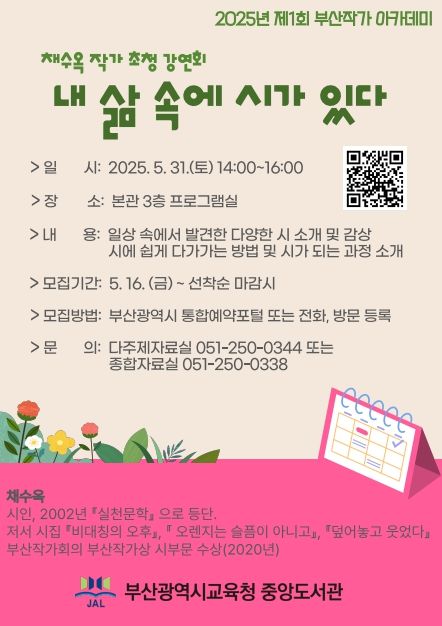 (아름다운교육신문) 부산시교육청 부산광역시립중앙도서관은 오는 31일 도서관 3층 프로그램실에서 성인 및 청소년 20명을 대상으로 2025년 제1회 부산작가 아카데미 ‘내 삶 속에 시가 있다’를 운영한다.
