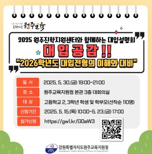 (아름다운교육신문) 원주교육지원청은 5월 30일 19시 원주교육지원청 3층 대회의실에서 ‘2025 원주진학지원센터와 함께하는 대입 설명회 '대입공감!!'’을 개최한다.