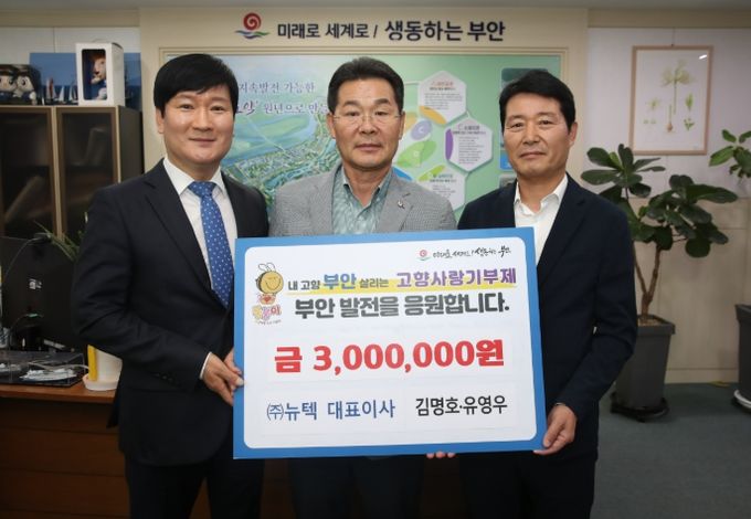 (아름다운교육신문) ㈜뉴텍 김명호·유영우 대표가 지난 14일 부안군 고향사랑기부금 300만원을 기탁하며 지역발전을 향한 진심 어린 마음을 전했다.