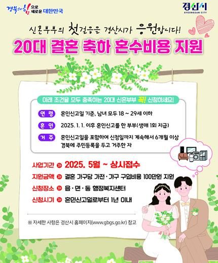 (아름다운교육신문) 경산시는 일찍 결혼하고 아이를 낳을 수 있는 여건을 조성하고자 19일부터 20대 신혼부부를 대상으로 결혼 축하 혼수비용 지원사업을 실시한다.