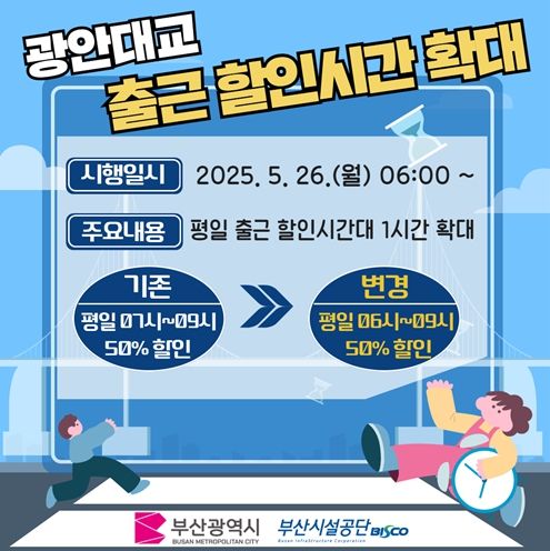 시는 실제 출근 시간이 광안대교 출근 할인 적용 시간과 달라 통행료 할인 혜택을 받지 못하는 시민들을 위해 이번 요금할인 시간 확대 시행을 결정했다.