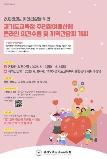 (아름다운교육신문) 경기도수원교육지원청은 2026년도 경기도교육청 예산 편성을 앞두고, 수원시민의 의견을 반영하기 위한 주민참여예산제 의견 수렴을 5월 19일부터 6월 5일까지 실시한다고 밝혔다.