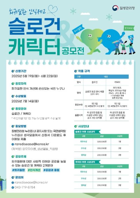 (아름다운교육신문) 질병관리청은 희귀질환에 대한 사회적 관심을 높이고 공감대를 확산하기 위해 '2025년 희귀질환 인식 제고 슬로건·캐릭터 공모전'을 5월 19일부터 6월22일까지 약 한 달간 개최한다.