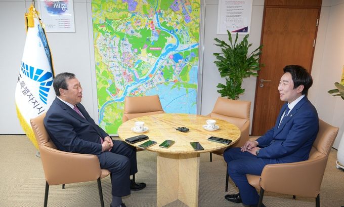 최민호 시장은 19일 시장 집무실에서 임채성 의장을 만나 행정수도 완성에 대한 시민들의 관심이 어느 때보다 높은 상황에서 향후 행정수도 세종 완성 대응 방안 등에 대해 의견을 나눴다.