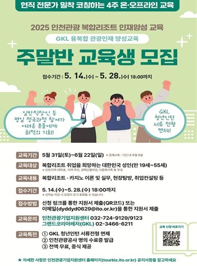 (아름다운교육신문) 인천광역시는 인천관광공사, 그랜드코리아레저와 함께 오는 5월 31일부터 6월 22일까지 매주 주말마다 ‘2025 인천 복합리조트 인재양성교육(GKL 융복합 관광인재 양성교육) 주말반’을 특별 편성해 운영한다고 밝혔다.