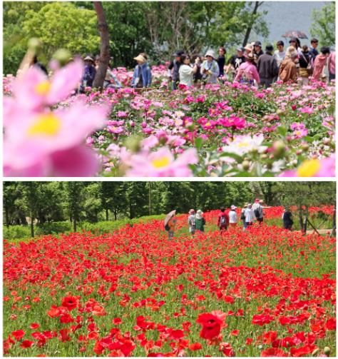 붕어섬 생태공원과 요산공원 일대 12,000㎡ 규모의 꽃양귀비밭은 바람에 흔들리며 붉은 물결이 출렁이는 듯한 풍경을 연출, 태양 아래 더욱 선명하고 강렬한 색감을 뽐내며 방문객들의 탄성을 자아내고 있다.