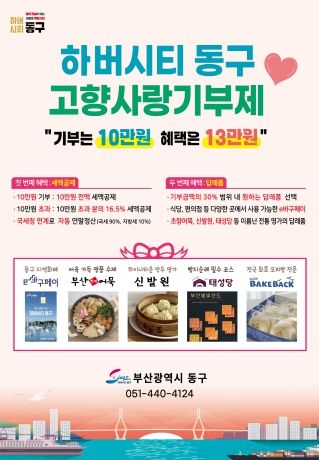 (아름다운교육신문) 부산 동구는 지난 20일 지역을 대표하는 인기 맛집 인 ‘태성당’과 ‘신발원’을 고향사랑기부제 답례품 공급업체로 추가했다고 밝혔다.