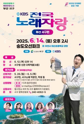 (아름다운교육신문) 대한민국 대표 장수 프로그램 KBS 전국노래자랑의 '부산 서구편'이 오는 6월 14일 오후 2시 송도오션파크에서 열린다.