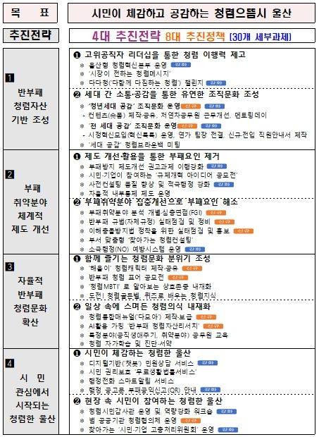 한편, 울산시는 이날 김두겸 시장 주재로 2025년 반부패 청렴정책 추진계획(4대 전략 30개 세부과제) 보고회를 갖고 울산시 고위공무원(실국장 이상)과 추진계획을 공유하고 청렴도 향상을 위한 방안을 모색하는 등 ‘청렴으뜸시’ 실현을 위해 적극적 노력한다는 계획이다.