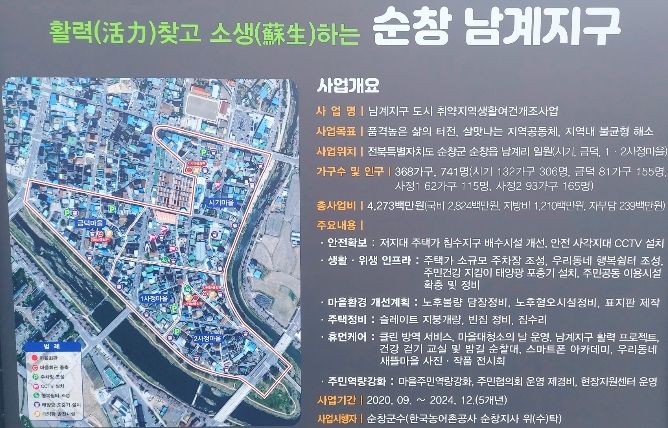 이번 사업은 순창읍 남계마을 일원을 대상으로 주거환경과 위생, 마을 안전 여건 등을 종합적으로 개선하는 데 중점을 두었으며, 단순한 기반시설 확충을 넘어 주민 삶의 질을 실질적으로 높이는 데 크게 기여했다.