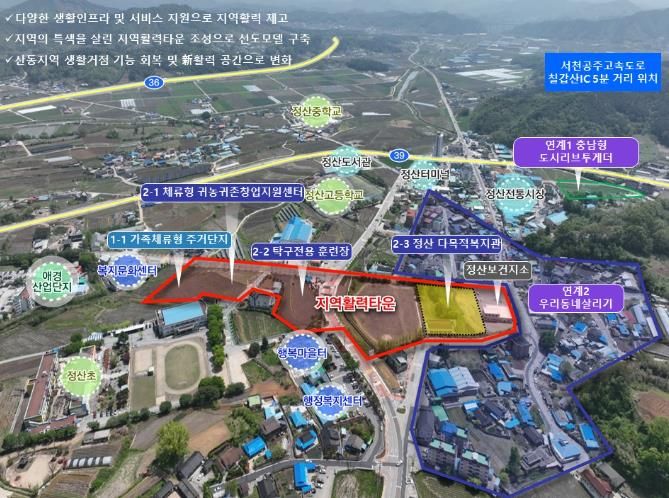 활력타운이 조성될 지역은 이미 탁구명문학교(정산초·중·고), 보건의료시설, 교육·행정기관, 전통시장, 산업단지 등이 반경 1km 내에 밀집된 ‘생활밀착형 농촌지역’이다.