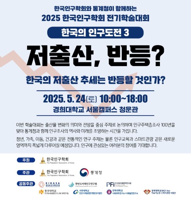 (아름다운교육신문) 통계청은 5월 24일 '2025년 한국인구학회 전기학술대회'를 한국인구학회와 공동으로 “저출산, 반등?”을 주제로 경희대학교 서울캠퍼스 청운관에서 개최한다.