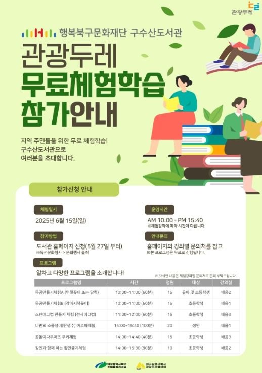 (아름다운교육신문) 대구 북구청은 오는 6월 15일 구수산도서관에서 북구 관광두레와 함께하는 주민참여형 체험 강좌를 운영한다고 밝혔다.