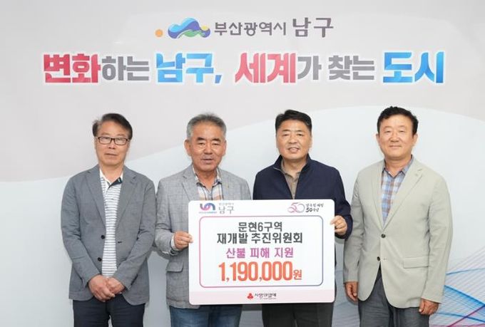(아름다운교육신문) 지난 23일, 부산 남구 문현6구역 재개발 추진위원회 부산광역시 남구에 산불피해 복구를 위한 성금 119만원을 전달했다.