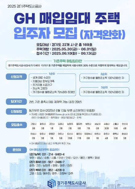(아름다운교육신문) 경기주택도시공사(GH)는 경기도 내 취약계층의 주거안정을 위해 매입임대주택 입주자를 모집한다고 26일 밝혔다.