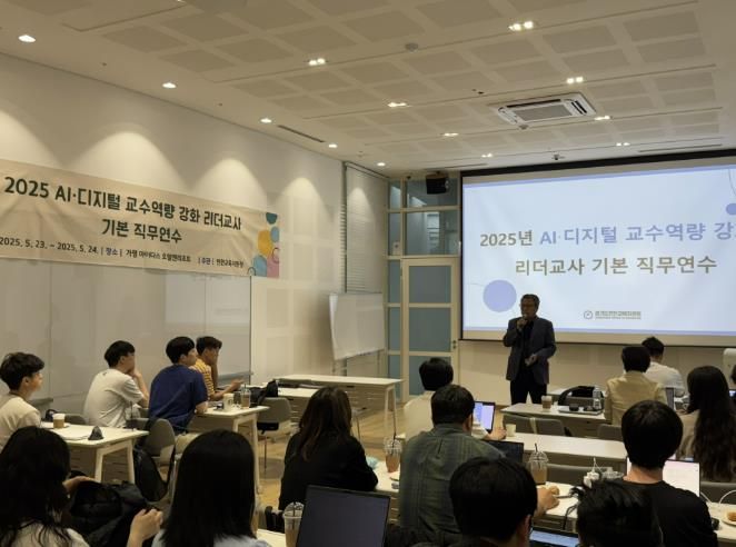 (아름다운교육신문) 경기도연천교육지원청은 2025년 5월 23일부터 24일까지 가평 마이다스 호텔앤리조트에서‘2025학년도 AI‧디지털 교수역량 강화 리더교사 기본 직무연수’를 성공적으로 개최했다. 이번 연수는 디지털 전환 시대의 수업혁신을 선도할 연천 지역 리더 교사를 대상으로 진행됐으며, 관내 에이드 지원단 소속 교사 중 희망자 30명이 참여했다.