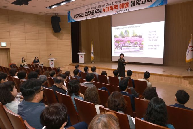 (아름다운교육신문) 울산 동구는 5월 26일 오후 2시부터 오후 6시까지 동구청 5층 중강당에서 5급 이상 공직자 40여 명을 대상으로 ‘2025년 간부공무원 4대 폭력 예방 통합교육’을 실시했다.