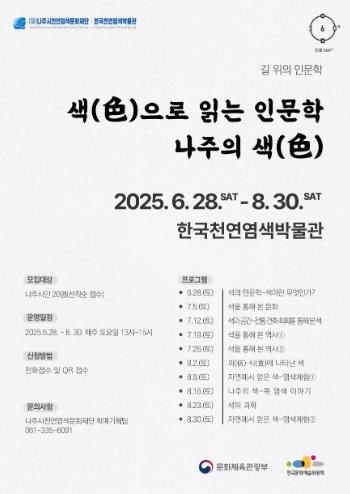 윤병태 이사장은 “이번 프로그램은 색을 통해 나주의 문화와 정체성을 인문학적으로 되짚는 의미 있는 여정이 될 것”이라며 “시민들이 문화와 인문학을 자연스럽게 체감할 수 있는 계기가 되길 바란다”고 말했다.