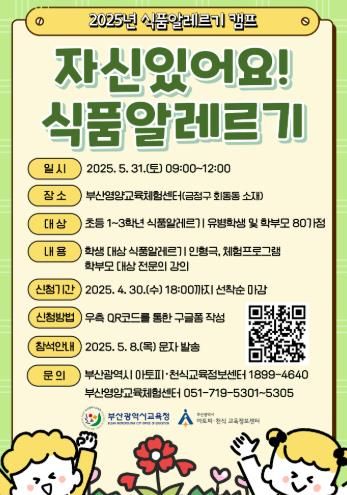 (아름다운교육신문) 부산광역시교육청은 31일 오전 9시부터 영양교육체험센터에서 초등학교 1~3학년 식품알레르기 유병 학생과 보호자 160여 명을 대상으로 ‘2025년 식품알레르기 캠프 – 자신있어요! 식품알레르기’를 개최한다고 밝혔다.
