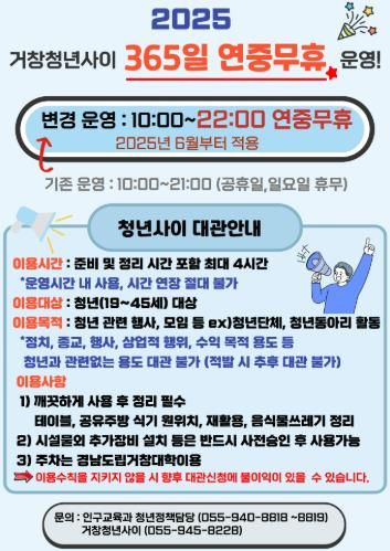 (아름다운교육신문) 거창군이 청년 거점 공간 ‘거창청년사이’를 6월부터 휴일 없이 365일 연중무휴로 운영하고, 운영시간도 오전 10시부터 밤 10시까지로 연장한다고 밝혔다.