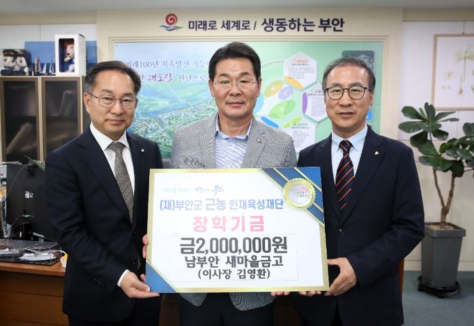 (아름다운교육신문) 남부안 새마을금고(대표 김영환)는 지난 27일 부안군 근농인재육성재단을 방문하여, 부안군 교육발전을 위한 장학금 200만원을 기탁했다.