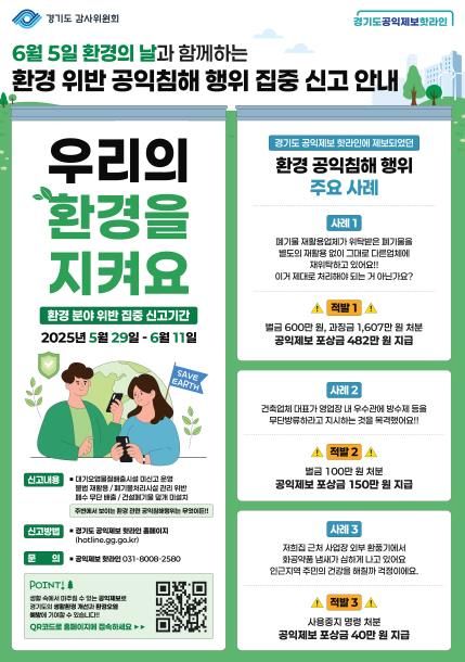 (아름다운교육신문) 경기도 감사위원회가 6월 5일 ‘환경의 날’을 앞두고 5월 29일부터 6월 11일까지 2주간 환경 분야 공익침해행위 집중 신고 기간을 운영한다.
