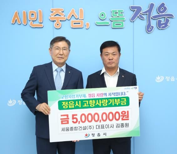 (아름다운교육신문) 정읍시에서 ‘감곡천 지방하천 정비공사’를 수행 중인 ㈜세움종합건설이 지난 28일, 정읍시청을 방문해 고향사랑기부금 500만원을 전달하며 지역사회에 대한 감사의 마음을 표했다.