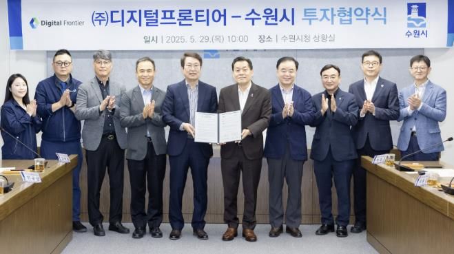 수원시와 ㈜디지털프론티어는 29일 시청 상황실에서 협약을 체결하고, 협력을 약속했다. 협약식에는 이재준 수원시장, ㈜디지털프론티어 오성구 대표, 김태영 전무 등이 참석했다.