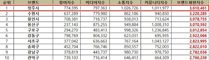 청주시는 △참여지수 774,395 △미디어지수 797,363 △소통지수 1,026,726 △커뮤니티지수 1,011,977로 총합 3,610,461을 기록했다.
