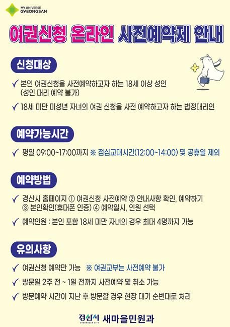 (아름다운교육신문) 경산시는 민원인의 편의 증진과 현장 대기시간 단축을 위해 오는 6월 2일부터 ‘여권신청 온라인 사전예약제’를 시행한다.
