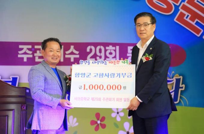 (아름다운교육신문) 함양군 서상중학교 총동문회와 제29회 주관회기는 지난 5월 31일 서상중학교 다목적 강당에서 열린 ‘제24차 서상중학교 총동문회 정기총회 및 동문화합행사’ 개회식에서, 함양군의 발전을 응원하며 고향사랑기부금 각 100만 원씩 총 200만 원을 기탁했다.