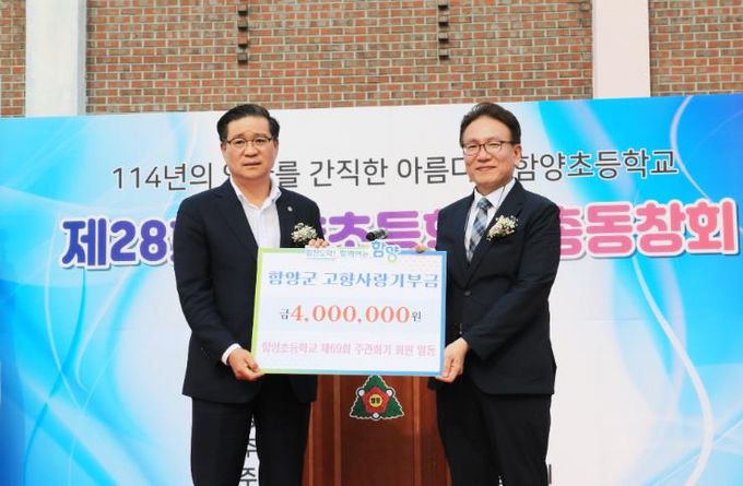 이번 기탁은 함양초등학교 교정에서 열린 ‘제28회 함양초등학교 총동창회’ 개회식 현장에서 진행됐으며, 제69회 주관회기를 맡은 류성욱 회장을 비롯한 동문들이 한마음으로 뜻을 모아 이뤄졌다.