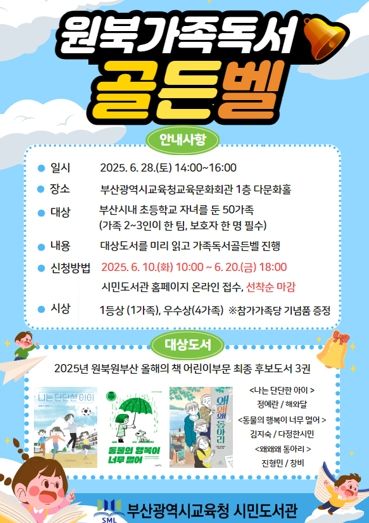 행사는 2025년 원북원부산 올해의 책 어린이 부문 최종 후보도서인 ‘나는 단단한 아이’, ‘동물의 행복이 너무 멀어’, ‘왜왜왜 동아리’ 3권을 미리 읽고 온 가족이 함께 가족독서골든벨을 진행한다.