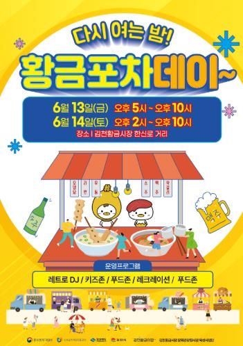 (아름다운교육신문) 김천시는 6월 13일 오후 5시부터 10시까지, 6월 14일 오후 2시부터 10시까지 황금시장 주변 한신로 일원에서 ‘다시 여는 밤, 황금포차데이’를 오픈한다고 밝혔다.