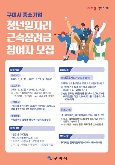 (아름다운교육신문) 구미시는 청년의 지역 정착과 중소기업의 인력 안정화를 위해 ‘청년일자리 근속장려금 지원사업’ 참여자를 6월 9일부터 27일까지 모집한다.
