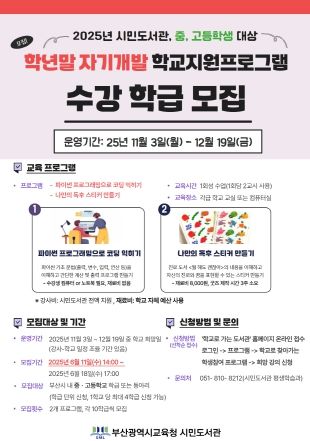 (아름다운교육신문) 부산광역시립시민도서관(관장 이은경)은 학년말인 11월 3일부터 12월 19일까지 부산시내 중·고등학교 학생들을 대상으로 ‘학년말 자기개발 학교지원 프로그램’을 운영한다.