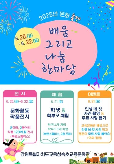 이번 행사는 속초교육문화관 북앤스페이스와 2층 로비, 야외 정원에서 열리며, △작품 전시 △체험 행사 △이벤트 프로그램 등으로 진행된다. 이번 축제는 문화강좌 수강생들의 활동 성과를 공유하고, 학생과 학부모의 문화 참여를 확대하기 위해 마련됐다.